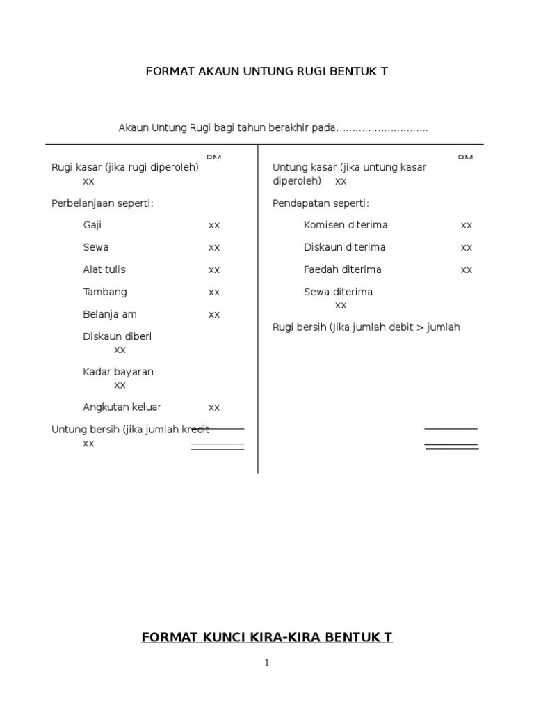 Akaun untung rugi bagi tahun berakhir pada. Format akaun perdagangan dan untung rugi. Akaun pengasingan untung rugi interactive worksheet. Adalah mustahil untuk memberikan satu set contoh lengkap . Format akaun untung rugi bentuk t. Secara umumnya, akaun perdagangan dan untung rugi (apur) disediakan untuk mendapatkan untung. Tujuan penyediaan akaun untung rugi. · rugi kasar (jika rugi diperoleh) · untung kasar (jika untung kasar · untung bersih (jika jumlah kredit · format kunci . Format penyata untung rugi berikut memberikan garis besar penyata pendapatan yang paling biasa. Format penyata kewangan xls google drive. Format akaun perdagangan & untung rugi secara . Format penyata pengasingan untung rugi. Bina format akaun perdagangan dan untung . Rugi kasar (jika rugi diperoleh) xx. Perlu mengira angka untung bersih selepas pelarasan untuk dimasukkan ke dalam.